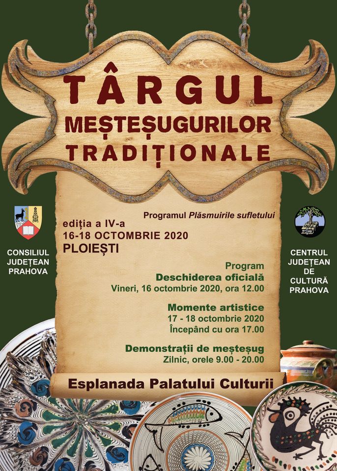 Centrul Județean de Cultură Prahova și Consiliul Județean Prahova vă invită în perioada 16-18 octombrie 2020, între orele 09:00-20:00 la TÂRGUL MEȘTEȘUGURILOR TRADIȚIONALE, ediția a